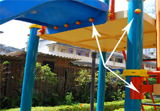 c: NUT BOLTS & OTHER FASTENERS: Galvanized / SS iron nuts, bolts, and other fasteners are used for all moving and non-moving type of play equipments. All the Fasteners used are standard ones. All bolts & nuts are totally galvanized & covered with high quality nylon caps.